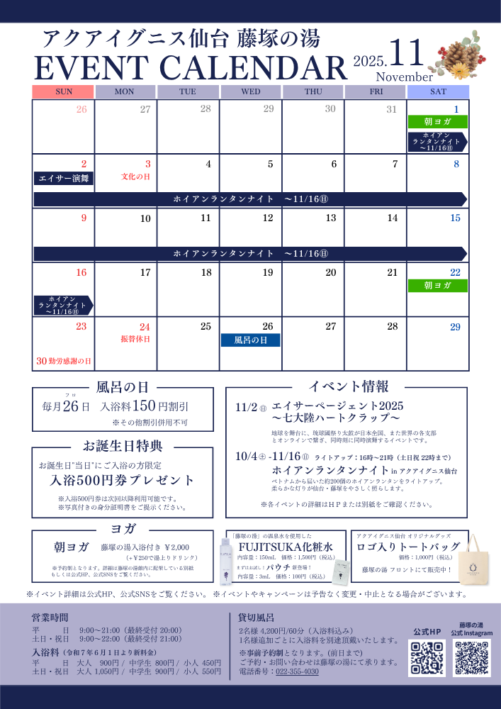 アクアイグニス仙台「藤塚の湯」2025年11月のイベントカレンダーです。