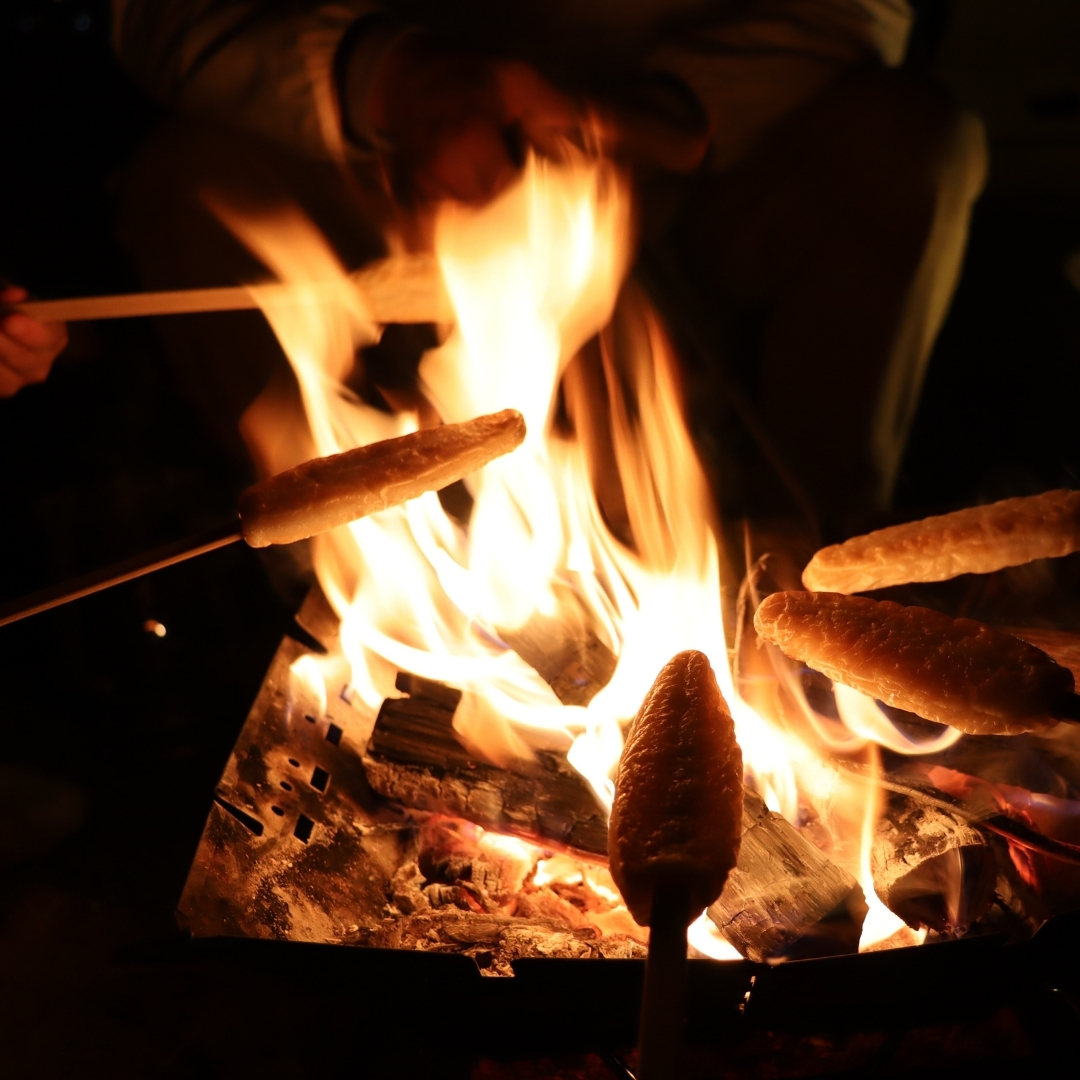 各サイトは約42㎡と余裕があり、木柵で区切られ、隣接サイトとのプライバシーを確保しています。車両の横にオーニングを広げても十分な芝地スペースを整備し、焚き火やBBQも可能です。