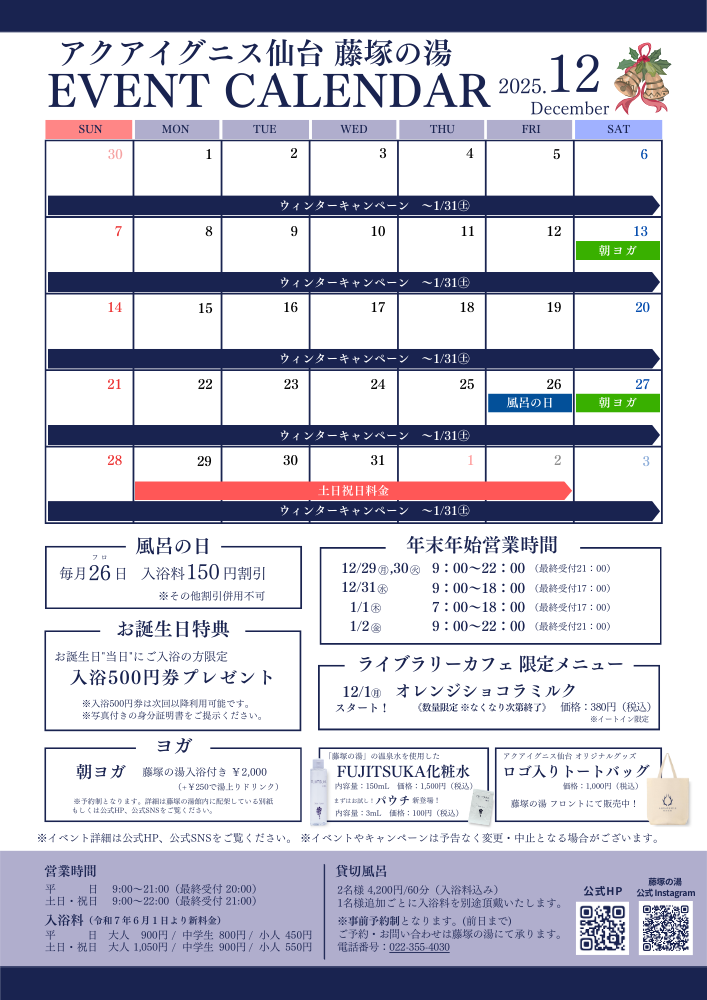 アクアイグニス仙台「藤塚の湯」2025年12月のイベントカレンダーです。