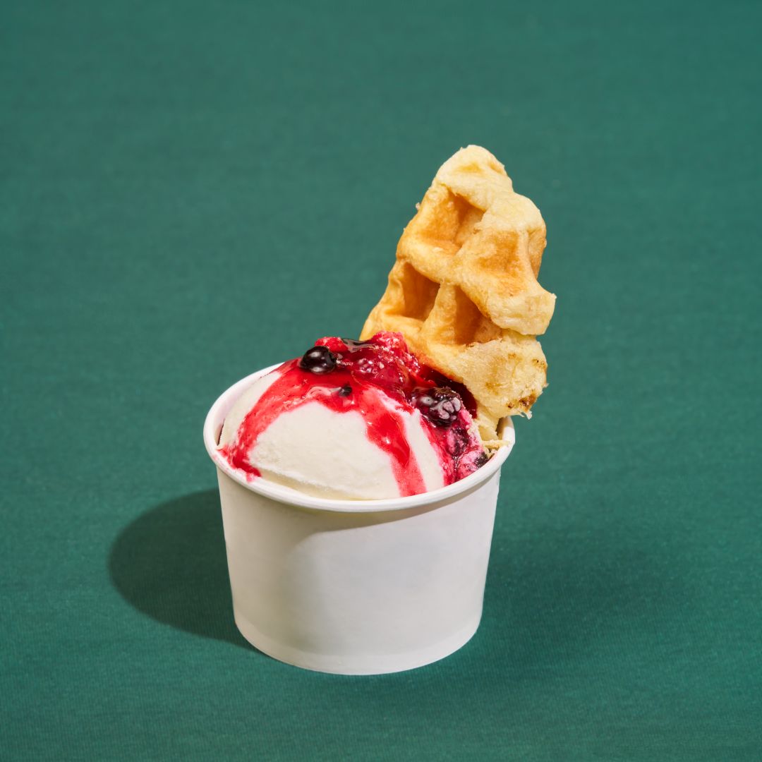 しっとりワッフルとお好みのアイスクリーム。甘酸っぱいベリーソース仕立て。