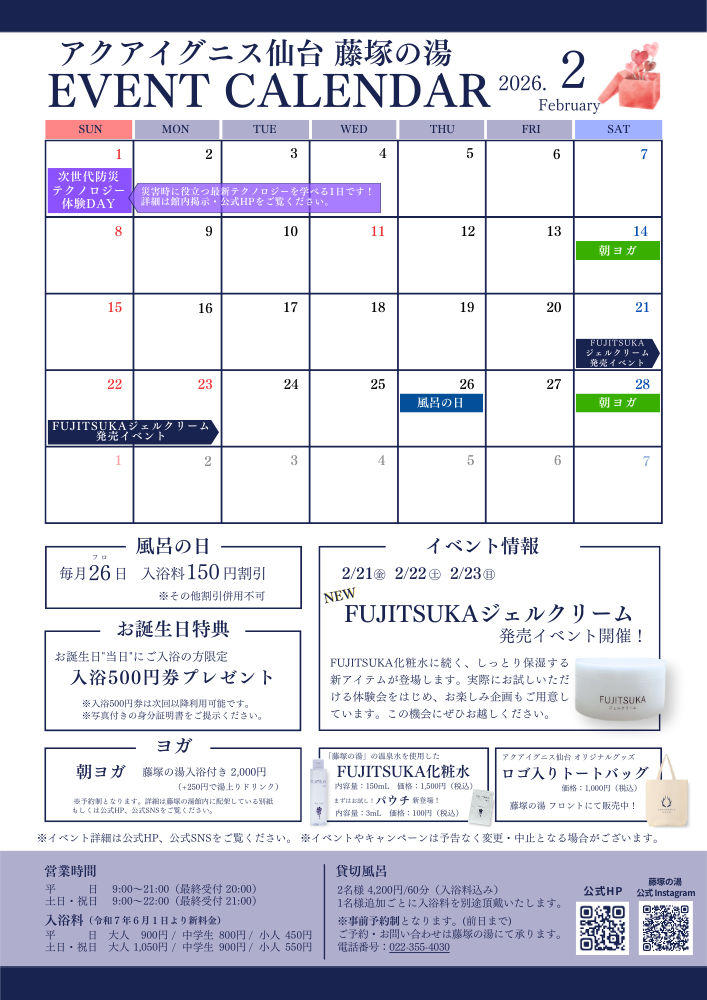 アクアイグニス仙台「藤塚の湯」2026年2月のイベントカレンダーです。