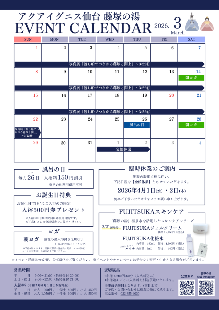 アクアイグニス仙台「藤塚の湯」2026年3月のイベントカレンダーです。